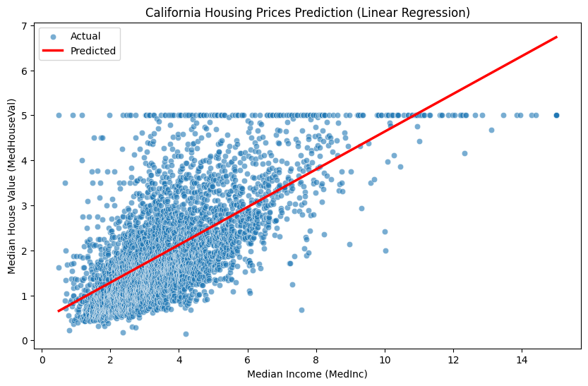 import numpy as npimport pandas as pdimport seaborn as snsimport matplotlib.pyplot as pltfrom sklearn.datasets import fetch_california_housingfrom sklearn.linear_model import LinearRegressionfrom sklearn.model_selection import train_test_split# Load the California housing datasethousing = fetch_california_housing(as_frame=True)data = housing.frame# Use only Median Income (MedInc) and Median House Value (MedHouseVal)data = data[["MedInc", "MedHouseVal"]]# Display the first 5 rows of the dataprint(data.head())# Split the data into training and testing setsX_train, X_test, y_train, y_test = train_test_split( data[["MedInc"]], data["MedHouseVal"], test_size=0.2, random_state=42)# Create and train a linear regression modelmodel = LinearRegression()model.fit(X_train, y_train)# Make predictions on the test datay_pred = model.predict(X_test)# Prepare data for visualizationplot_data = pd.DataFrame({'MedInc': X_test['MedInc'], 'MedHouseVal': y_test, 'Predicted': y_pred})# Sort for better line plot visualization. Crucially, sort *after* prediction.plot_data = plot_data.sort_values(by='MedInc')# Visualize using Seabornplt.figure(figsize=(10, 6))sns.scatterplot(x='MedInc', y='MedHouseVal', data=plot_data, label='Actual', alpha=0.6)sns.lineplot(x='MedInc', y='Predicted', data=plot_data, color='red', label='Predicted', linewidth=2.5)plt.title('California Housing Prices Prediction (Linear Regression)')plt.xlabel('Median Income (MedInc)')plt.ylabel('Median House Value (MedHouseVal)')plt.legend()plt.show()# Print the trained weight (coefficient) and bias (intercept)print("Weight (Coefficient):", model.coef_[0])print("Bias (Intercept):", model.intercept_)