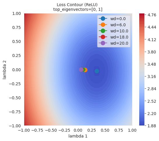 Visualisierung der Verlustebene: (Code weggelassen) L1-Regularisierung erzeugt rautenförmige, L2-Regularisierung kreisförmige Restriktionsbedingungen, sodass die optimalen Lösungen an verschiedenen Positionen entstehen.