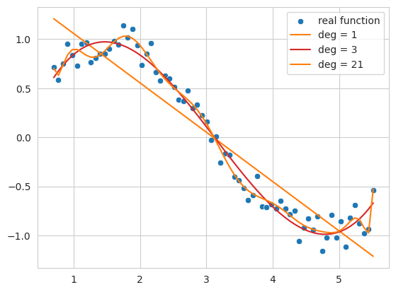 sns.scatterplot(ax=axes, x=x, y=y, label='real function', s=50) # Increased marker size