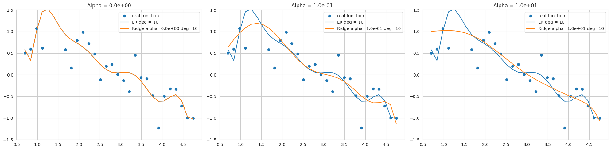 Da es sich um eine dritte Ordnung handelt, erhöhen sich die \(x\)-Werte zu \(x^2, x^3\). Zum Beispiel 0.3490, 0.1218 (Quadrat von 0.3490), 0.04253 (Kubik von 0.3490). Wenn es sich um eine zehnte Ordnung handelt, werden die Daten bis \(x^{10}\) generiert. Der Alphawert des Strafterms kann Werte von null bis unendlich annehmen. Je größer der Alphawert ist, desto stärker ist die Regularisierung. Wir werden den Grad auf 13 festlegen und die lineare Regression mit Ridge-Regression bei unterschiedlichen Alphawerten vergleichen.