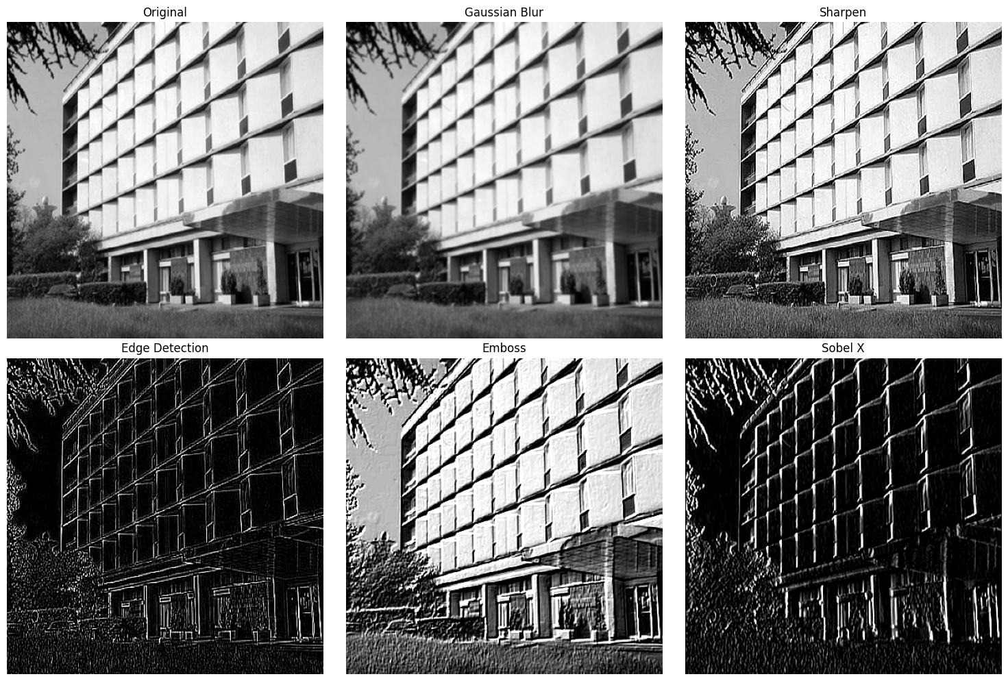 show_filter_effects 분석: (코드 생략) show_filter_effects 함수는 주어진 이미지에 다양한 필터(Gaussian Blur, Sharpen, Edge Detection, Emboss, Sobel X)를 적용하고 그 결과를 시각화합니다. 각 필터는 이미지의 특정 특징(흐림, 선명하게, 경계 검출 등)을 강조하거나 변형합니다.